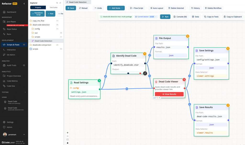 Build multi-step refactoring workflows as directed graphs. Each node is a discrete step — configure, run, inspect results inline. Deploy detection and remediation flows in your CI/CD pipeline to keep your code clean and modern going forward.