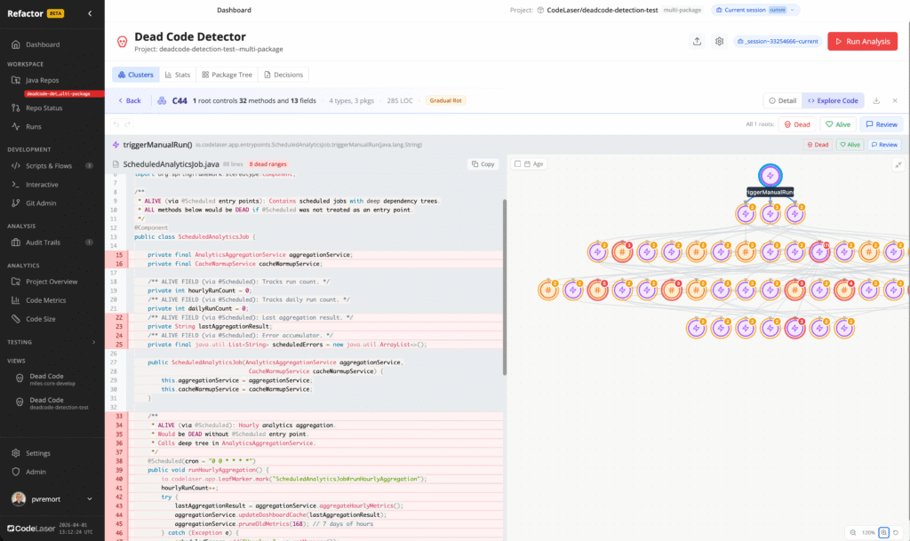 Reachability analysis from real entry points. Dead code highlighted in source, clustered into dependency trees. Remove entire groups in one operation, down to the minute rippling effects in parameters, types and interfaces. All with a few powerful statements, and extensive human review where needed.