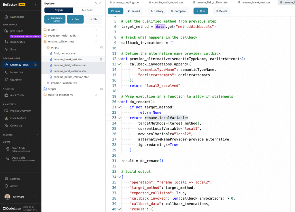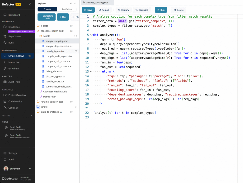 Write analysis and refactoring logic in Starlark (Python) against the complete CodeLaser code model — types, methods, call graphs, dependencies. Version-controlled, reproducible, team-shareable. Use MCP to let your A.I. agent write code for what you want to achieve.